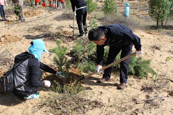 在分包的植树活动现场,处处是忙碌的身影。大家自发结组,分工明确,密切配合,充分发扬不怕苦、不怕累的工作精神,有的挥锹铲土,有的扶苗填坑,有的培土固根,每道工序井然有序。经过大家2个多小时的共同努力,100余株樟子松树苗像士兵一样整齐的站立在春天里。