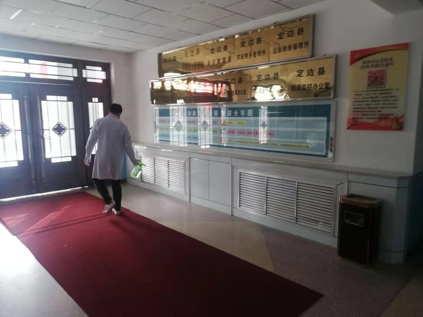 对财政局办公大楼喷洒消毒剂