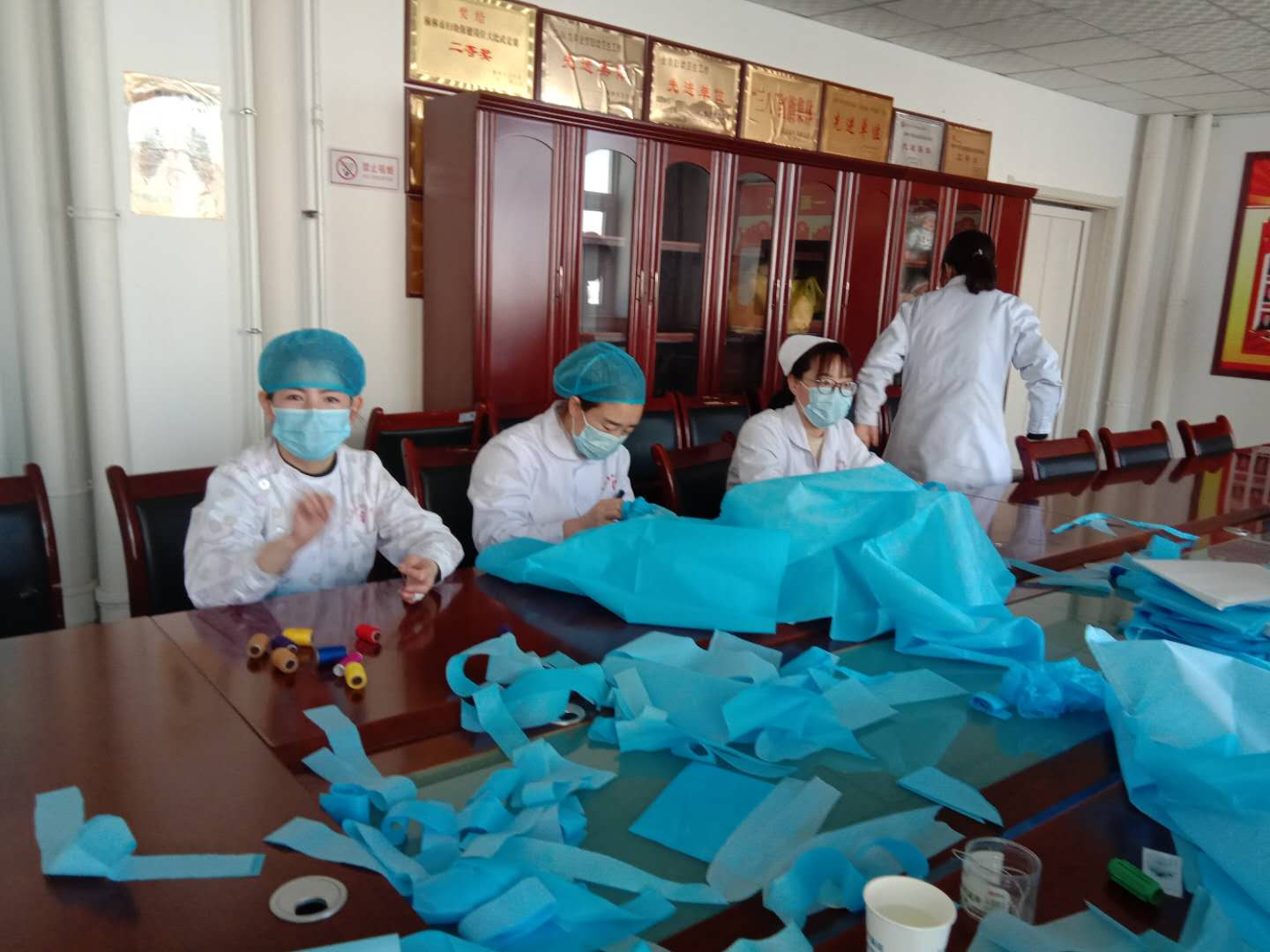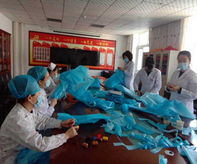 我院未开封的一次性医用无纺布床单被罩储备量大,这些无纺布本身就可以防水防污染,并且容易裁剪和塑形。我院医务人员灵机一动:何不把它做成 " 防护服 ",把它和隔离衣穿在一起,用土办法做成简易版的防护服。经过几次试验,一件“山寨版”的防护服问世了。这些自制的防护服,弥补了一次性隔离衣脖子防护效果不佳的缺陷。