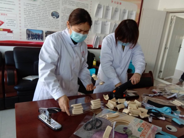 防护面罩也是很宝贵的资源,同样极其紧缺。我院医务人员在院感科科长石晓云和护理部主任钟艳娥的带领下,从总务科找到了透明软塑板,将防撞条裁剪成小细条儿用双面胶粘在透明软塑板上,最后把松紧带用订书机装订好,自制了防护面屏,可以直接绑在头上,有了类似防护面罩的效果。