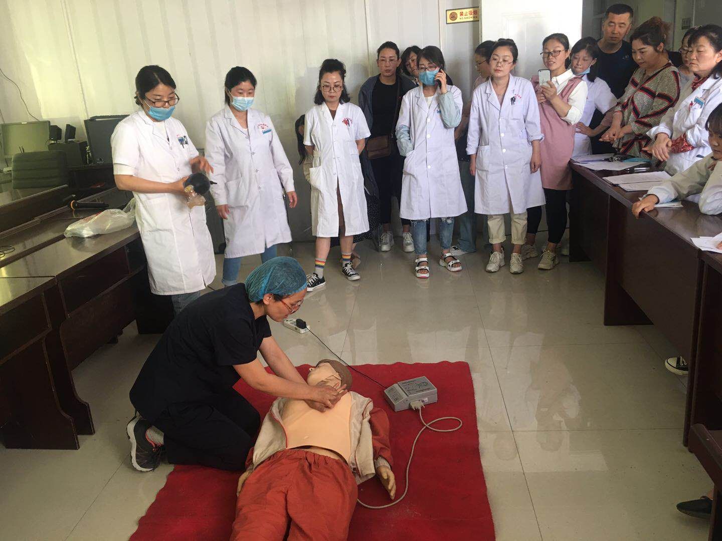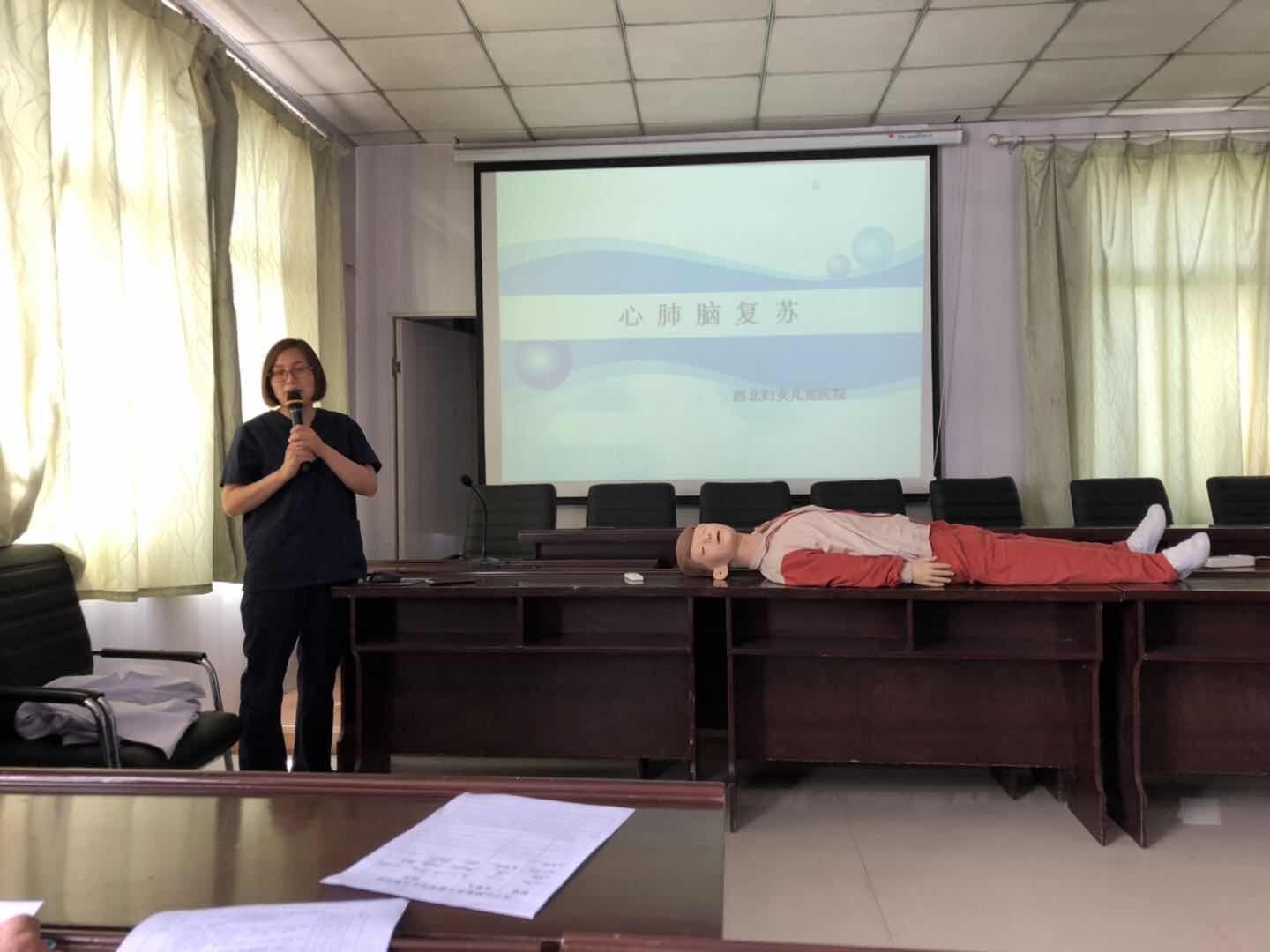 对口支援我院的西北妇女儿童医院妇产科主治医师王彩英讲解了心肺复苏理论知识,重点强调现场急救中“黄金八分钟”的意义、如何掌握基本心肺复苏技术操作要点及注意事项,判断是否丧失意识、有无自主呼吸、有无脉搏、胸外心脏按压、清理口腔异物、开放气道、人工呼吸等操作要领通过对“模拟人”实施心脏复苏抢救操作同步演示,进行了现场模拟示范教学。